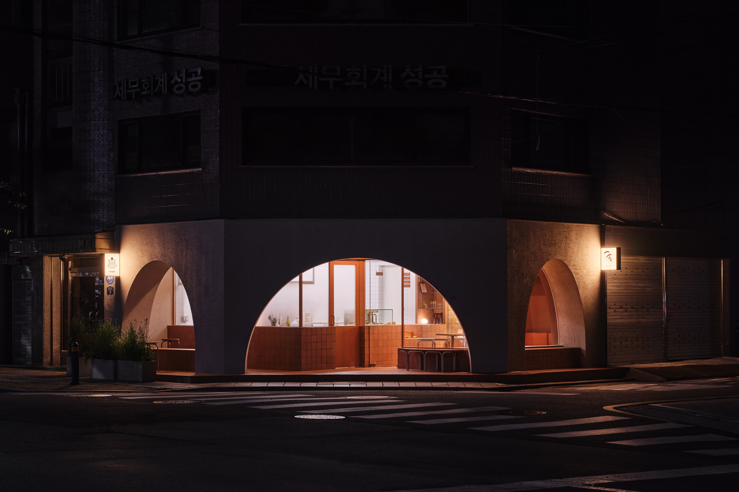 공간은 크게 파사드, 필로티, 실내로 구성되어 있습니다. 기존에 있던 4개의 건축 기둥을 새로운 형태로 연결하여 열린 파사드를 만들었고, 열려있는 입면의 형태는 저녁이 되면 내부의 빛을 통해 더욱 뚜렷하게 드러나 시각적 대비를 만들어 냅니다.