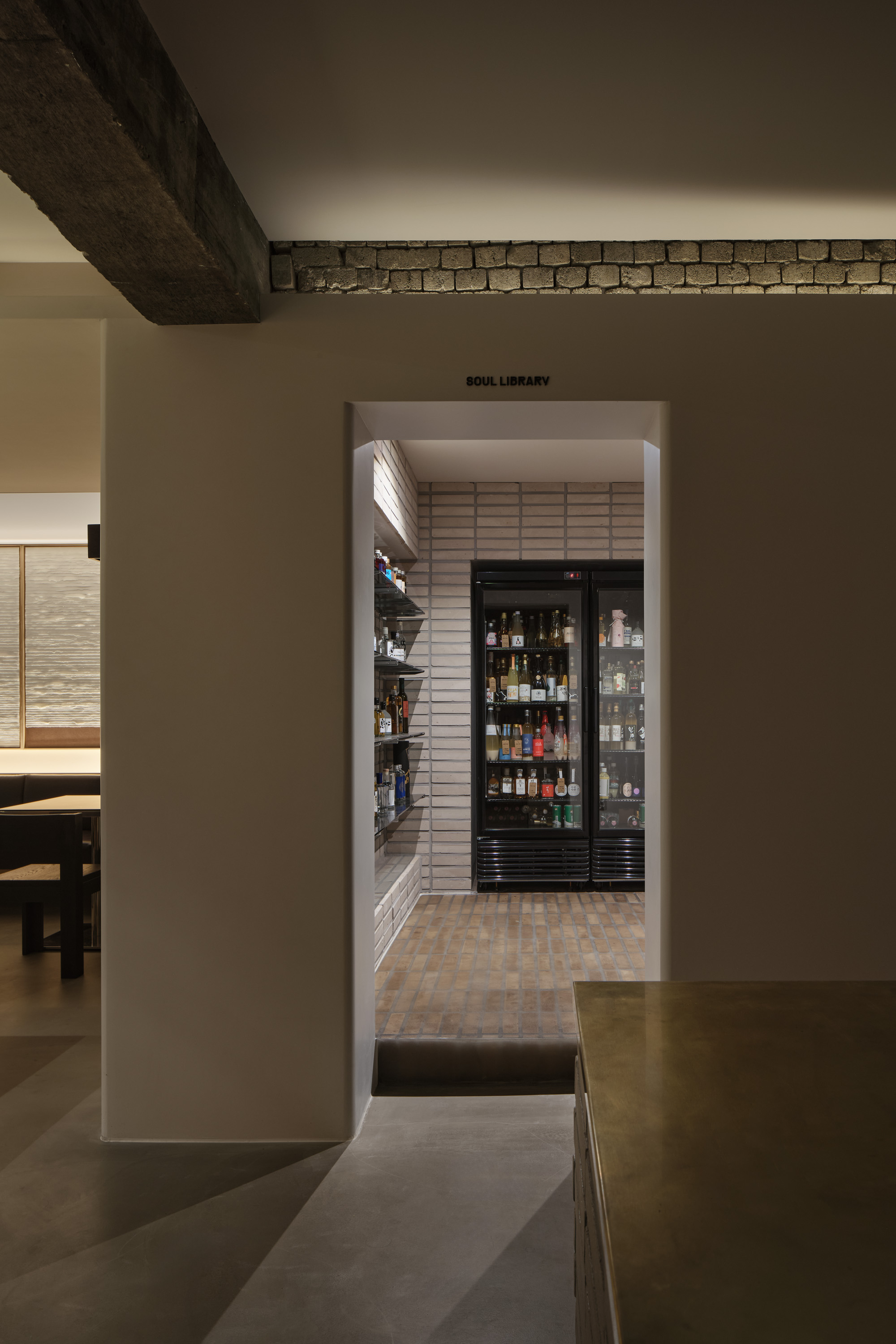 Soulae is located on the top floor of a dead end. In the order of entrance-counter-display-main bar-seat, you will gradually move from the transition space to the expanded space.